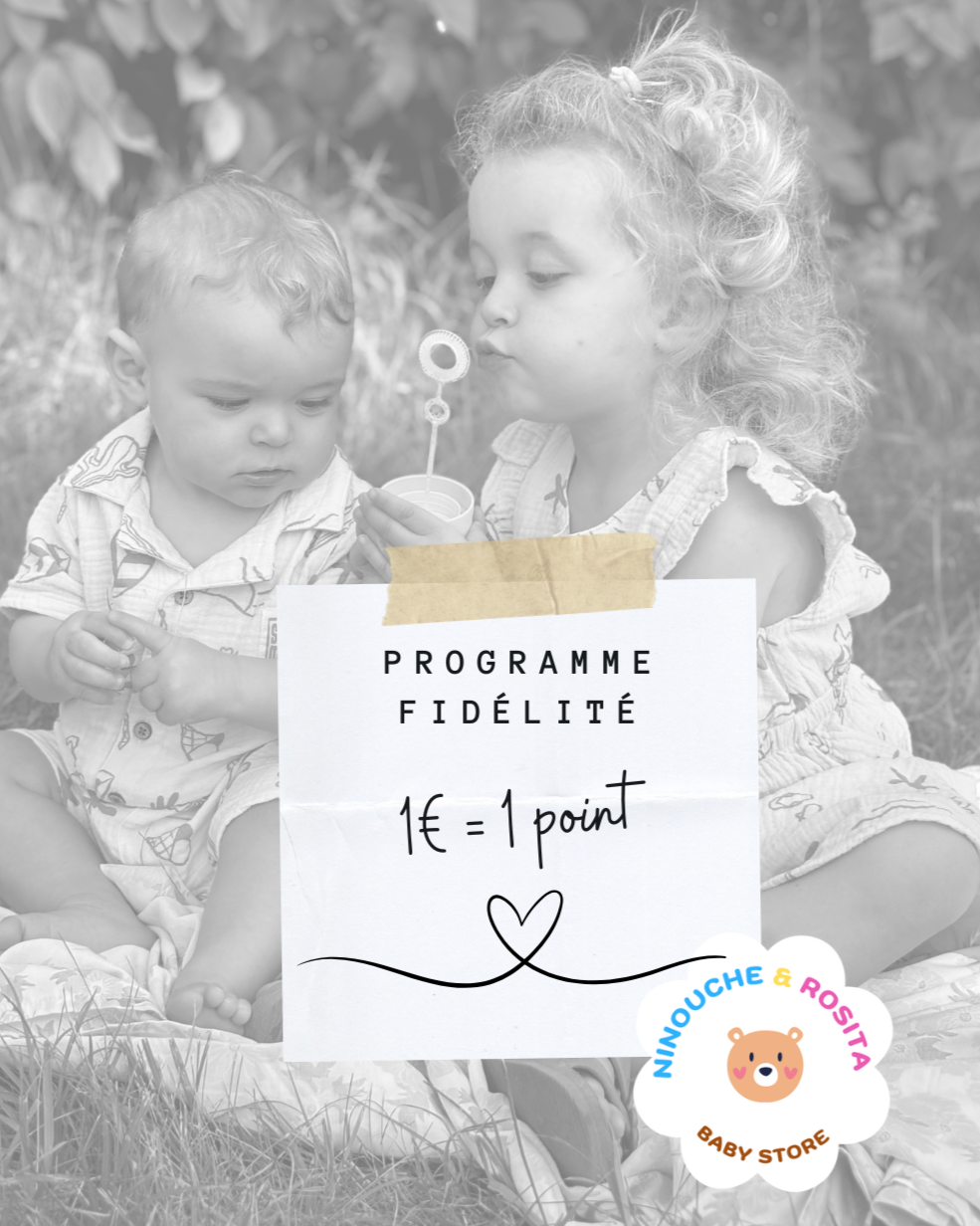 Profitez de notre programme de fidélité chez Ninouche & Rosita : pour chaque euro dépensé, vous gagnez 1 point. Cumulez vos points pour débloquer des récompenses exclusives et des offres spéciales!